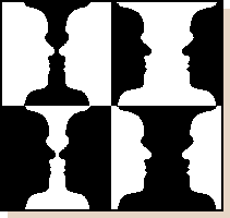 Images such as this are ambiguous concerning figure and ground. Is the figure a white vase (or goblet, or bird-bath) on a black background or silhouetted profiles on a white background? Perceptual set operates in such cases and we tend to favour one interpretation over the other (though altering the amount of black or white which is visible can create a bias towards one or the other). When we have identified a figure, the contours seem to belong to it, and it appears to be in front of the ground.