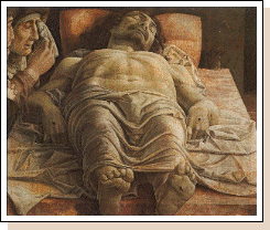In tackling the task of depicting the foreshortened body of the dead Christ, even the great Renaissance artist Andrea Mantegna (1431-1506) clearly felt that he needed to compensate for the sacrilege of the distortion introduced by linear perspective, since he both reduced the size of the feet and enlarged the head, showing a 'sense of proportion' appropriate to his subject. Alberti had written that verisimilitude should be tempered by appropriate respect for dignity and decorum (Alberti 1966, 72-7).