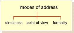 The modes of address employed by texts within a code are influenced primarily by three inter-related factors: