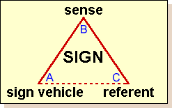 Η διακεκομμένη γραμμή στη βάση του τριγώνου έχει σκοπό να δείξει ότι δεν υπάρχει αναγκαία καμμιά ορατή σχέση μεταξύ του σημειοφόρου και του αναφερομένου