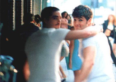 Two well-built young men in tight white t-shirts and jeans are seen walking together