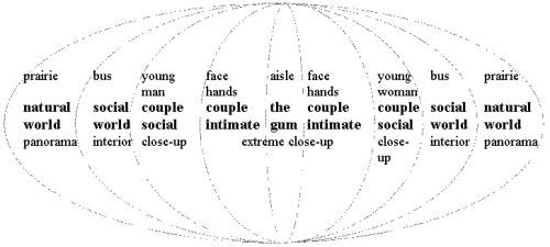 The overriding impression, then, is of a young man and woman meeting in a beautiful landscape, as part of a harmonious and approving society. It is also a very American world: the prairie, the old-timer, 'The Rosebud' (the same name as the sled which symbolizes lost childhood in Citizen Kane). It centres upon the monogamous heterosexual relationship of a man and a woman, which in turn centres upon the product - chewing gum. The bus, the social world, moves through the world of nature. A further harmony between the human and natural world is effected by the echo of the colour of the corn in the colour of the young woman's hair. In the shots of the interior of the bus, the couple are at the middle, moving, but apparently still, with the agricultural world visible outside the window. Like any couple, they have both a social identity (as they appear to, and with, the other passengers) and a private identity, as they appear to each other (the close-ups). At the very heart of this image is the stick of gum, passed from hand to hand, which brings them together and forms the bond between them. These concentric levels of detail are best represented diagrammatically.
