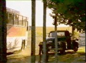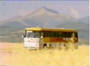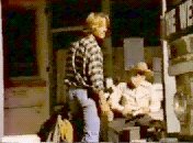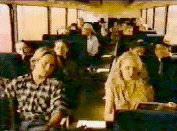 The bus stops outside a building called 'The Rosebud'. Outside, there is a van parked and a horse tethered, a cartwheel leaning against the wall. An 'old-timer' with a large white beard is sitting on the porch whittling a piece of wood. The young man is leaving the bus. He turns and raises his hands in a gesture of resignation. We see the young woman's face close up. She looks down sadly. Inside, the young man sits down, while outside the bus pulls away. As the young man sits dejected, the young woman enters behind him. She has got off the bus to be with him.