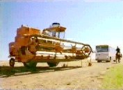 5   Cut to external shot. The moving coach is framed between a combine harvester (filling the foreground) and a man on a horse to the RHS.