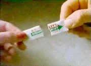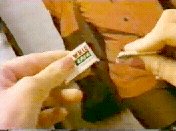 Cut to close-up of hand on top RHS, joined by hand at bottom LHS as the two halves of gum are brought together. The nails on the hand on LHS are longer and are manicured.