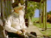 18 '...Let's move...' Shot of man with white beard and large hat sitting by entrance. He is whittling a stick and looks up.