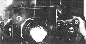 A key requirement in front-projection is that the camera and projector be so precisely aligned that, in terms of physics, the projected light source and the center of the camera lens are located at the same point. Or, in more graphic terms, as if the light source were inside the camera. This is essential because of the peculiar uni-directional reflectivity of the screen material used, which produces a phenomenal gain in brilliance - but only when projected light is reflected directly back to its source.