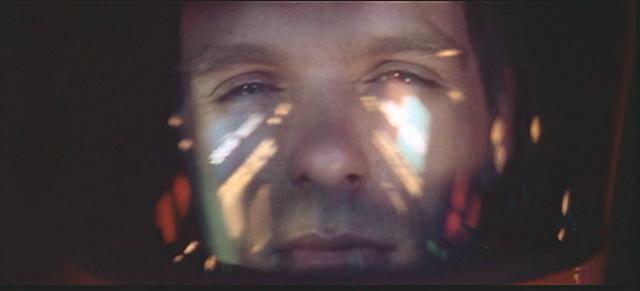 As astronaut enters a different time space dimension near Jupiter, bright colors flash across his visor. These were actually reflections from the pod instrument panel, filmed at 12 frames-per-second.