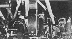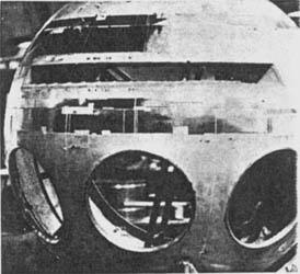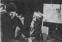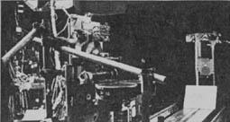 A few scenes show a miniature rear-projected image in the window of a spacecraft as the spacecraft is matted over an image of the moon. For this effect the foreground spacecraft was a still photograph mounted on glass and, using a hi-pack camera, the masters of the background image could be printed with a white backing behind the still photo - the photo silhouette producing its own matte. Then the photo and the rear-projected image could be shot as separate exposures onto the same negative. To produce exactly the same movement on each successive exposure, all movement drives and film advances were selsyn synchronized. The mammoth device designed to produce this effect we nicknamed the "Sausage Factory," because we expected the machine to crank out shots at a very fast rate. This turned out to be wishful thinking, however, and shooting became very painstaking and laborious work. Another drawback to printing masters in this way was the fact that lens flaring caused by the white backing would partially print the image within the silhouette. Therefore only very dark backgrounds could be used for these shots.