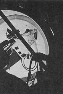 (Left) Astronaut hangs vertically by wires with camera pointing directly upward. He is shown here at the top of his fall toward camera lens. (Right) Astronaut on wire at bottom, after falling toward camera. (Middle) The scene as it appears in the film, after he had blasted his way through the vacuum of space into an air-lock of the spacecraft.