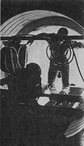 The interior of the space station was a giant curved set over three hundred feet long, and sloping up at one end to nearly forty feet. It may be noticeable that in the long shot of two men approaching the camera from the far end, their pace as slightly awkward, and this was due to the very steep slope at that end of the set. Most action took place in the more comfortable area at the bottom. The Earth image seen through the window of the space station was a rear-projected four-by-five transparency in a special rotating mount.