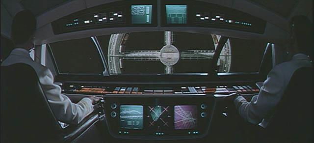In the cockpit of the Orion spacecraft, during its approach to the space station we begin to see a few of the 35mm animated, rear-projected computer displays on multiple screens. Throughout the space sequences these displays depict the activities of computers on board the Orion, Aries, Moon Rocket Bus, Discovery, and Pod spacecraft.